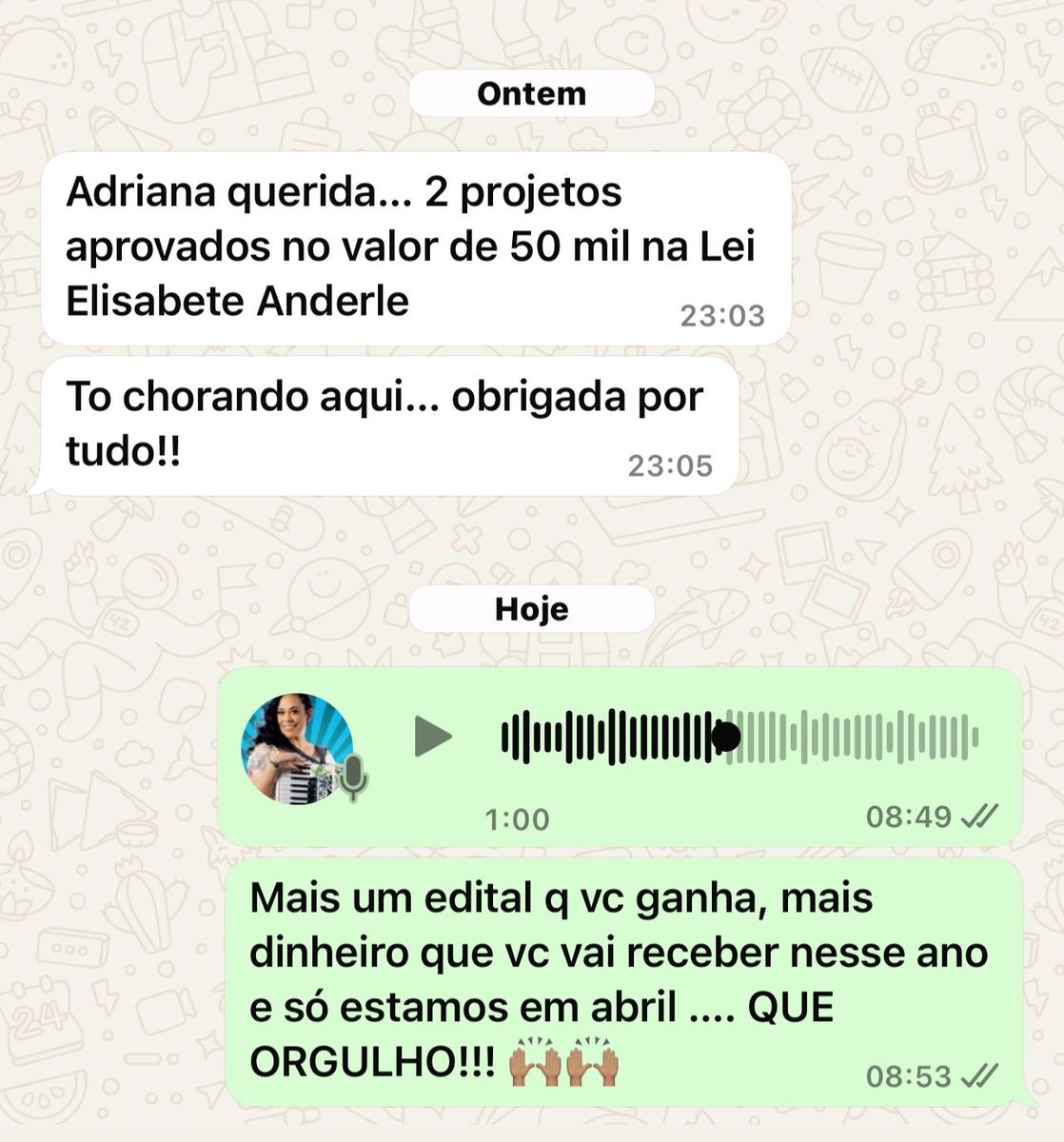 Além da trajetória artística, Adriana se tornou uma das maiores referências no Brasil quando o assunto é aprovação de projetos culturais em editais e leis de incentivo. Já ajudou centenas de profissionais da música a transformarem ideias em projetos viáveis conquistando patrocínios de R$50 mil, R$100 mil ou mais.